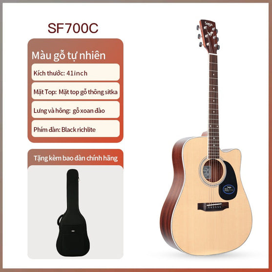 Saga SF700C là một cây đàn guitar acoustic bằng gỗ vân sam sitka nguyên khối hàng đầu của Saga. Thời gian trôi qua càng lâu, gỗ sẽ càng khô, tạo ra âm thanh rõ ràng và vang hơn. Gỗ vân sam sitka, nổi bật ở dải trung. Trộn với mặt bên và mặt sau bằng gỗ gụ (mahogany) làm cho âm thanh phát ra khá dày và mềm mại. Được thiết kế dáng dreadnought với cần đàn oval để dễ dàng solo. Hình dạng thân đàn lớn cho ra âm thanh bass lớn hơn. Các chi tiết được sử dụng được coi là tốt hơn so với giá cả trên thị trường nhạc cụ hiện nay. Từ cần đàn gỗ Nato cho đến mặt phím đàn Richlite. Các điểm inlay có thể nhìn thấy rõ ràng, đai ốc và yên ngựa được làm từ xương bò tốt hơn so với một số mẫu nhựa vì chúng bền hơn. Tuyệt vời cho những người mới chơi đàn muốn sở hữu cho mình một cây đàn guitar chất lượng ngay từ ban đầu.