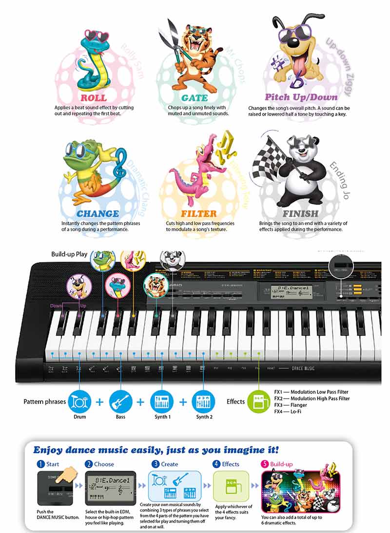 Hoặc bạn có thể sử dụng chức năng Chơi đắp nối để áp dụng các hiệu ứng âm thanh đặc trưng của nhạc khiêu vũ và làm cho bầu không khí thêm phần sôi động. Bạn chỉ cần nhấn các phím màu đen được chỉ định để tăng thêm sức sống cho âm nhạc với sáu hiệu ứng âm thanh đầy ấn tượng!